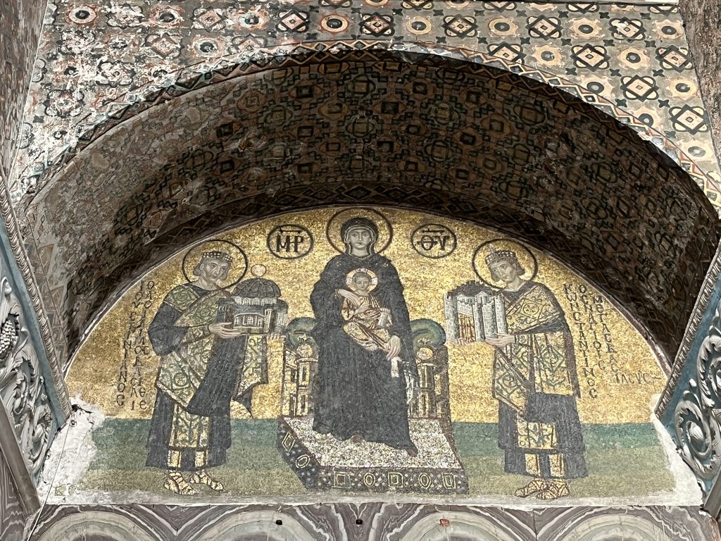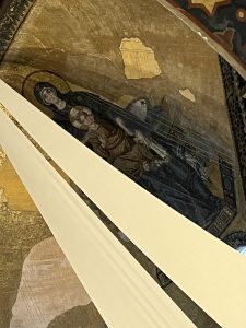 A mosaic of the Virgin Mary bestrides the apse on a glorious golden background. It dates from 867 and was the first figurative mosaic to be added to the church after the end of the Iconoclastic period when Christianity was just as prohibitive of human imagery in religious buildings as Islam is today. Since 2020 it has been shrouded with curtains so that worshippers don’t have to look at it although it can still be glimpsed side on from the gallery.