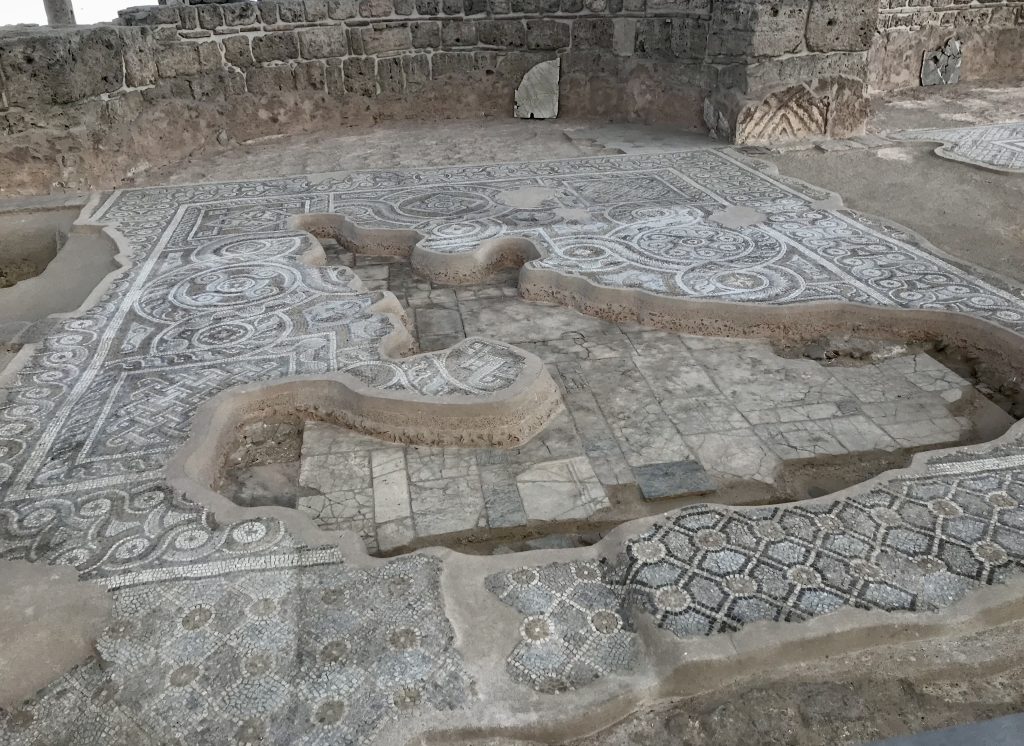 Behind the temple the basilican church mentioned in the Bible has been painstakingly reconstructed with all its glorious mosaic floors.