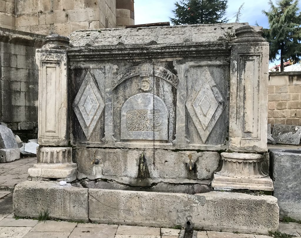 Today the entire walled complex has been completely restored. It still retains many of the ancillary buildings of a mosque complex including a many-chimneyed aşevi (cookhouse), a semahane (dancefloor for dervishes) and a medrese (seminary) even though the colourful atmosphere of the days of the dervishes and pilgrims is no more. Look around the courtyard and you’ll see many pieces of stone left over from the monastery. An even older sarcophagus has been pressed into service to make a fountain with, right beside it, an old baptismal font presumably taken from the lost monastery. The columns of the portico of the mosque and some of the plinths and capitals in the complex are also reused from older buildings.