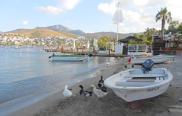 When you reach the shore turn right for the most upmarket hotels and restaurants of old Göltürk and left for the slightly more reasonable hotels, restaurants and shops of old Türkbükü with the original fishing harbour at the furthest end of the strip.