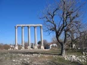 Nearby stand the substantial remains of a Temple to Zeus Olbios, originally constructed in 295 BC by Seleucus I Nikator. It was the first peripteral temple in Asia Minor (i.e. tample surrounded by columns) and the first to incorporate Corinthian capitals into its architecture. Th temple was turned into a basilican church in Byzantine times.