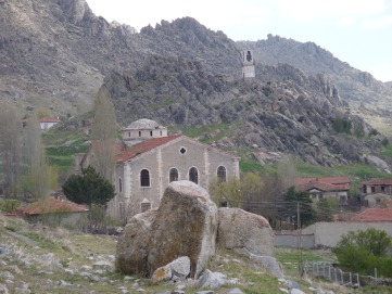 Armenian church in foreground, clocktower in backgroundA short walk away stand the remains of the enormous Surp Yerrortutyan (Holy Trinity) church built in 1881 on the site of a church dating back to 1650 for use by the Schismatic (Apostolic) Armenians, a group that had broken away from the Greek Orthodox Church after the Council of Chalcedon in 451. Towards the end of the 19th century there were about 300 such families living in Sivirihisar, according to the British traveller, William Hamilton. The front part of their church was later pressganged into service as a power station. Today it stands abandoned, although the dome has been restored.