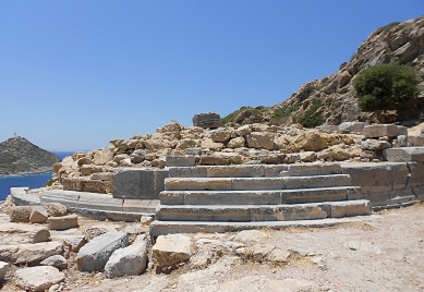More important are the remains of the circular temple (tholos) to Aphrodite in a magnificent position looking straight out to sea. It is surrounded by the remains of what may have been storerooms for treasure and a dormitory for visitors. The surviving complex dates back to the second century AD.