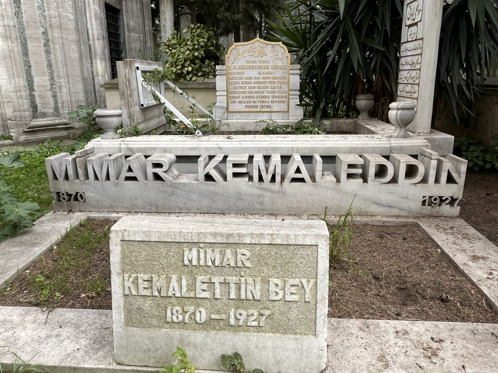 As well as being an architect, Kemaleddin Bey was a restorer of historic buildings, including the Hünkar apartments attached to the Yeni Cami in Eminönü and the Fethiye Cami in Karagümrük. Unlike Vedat Tek, he carried out much of his work abroad, for example at the al-Aqsa mosque in Jerusalem. Kemaleddin Bey seems to have died of a heart attack on the site of the Ankara Palas which still exhibits the turrets that were one of his trademarks. He was originally buried in the Karacaahmet Cemetery before being re-interred in the grounds of Beyazıt Cami. His portrait appears on the reverse of the TL20 banknote.