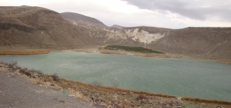 If you’re driving west through Cappadocia from the underground city at Derinkuyu to Güzelyurt or the Ihlara Valley via the “underground city” at Gaziemir you might want to divert briefly to the left of the highway to see the impressive, ice-blue crater lake at Narlıgöl.
