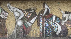 Two more vividly colourful mosaics lurk amid the unprepossessing İMÇ buildings. The first, designed by the poet-artist Bedri Rahmi Eyüboğlu (1911-73), defies its lack of a title to evoke the Bosphorus wending its languorous way past the mosques and palaces of the city on a sunny day. The second, by his Romanian-born wife Eren Eyüboğlu (1907-88), depicts the people of Anatolia riding donkeys and dressed in brilliantly colourful clothing.