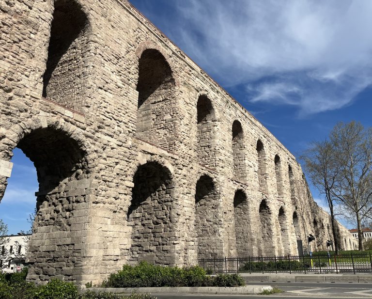As you near the top of the hill the traffic is funnelled through a remarkable monument. The most conspicuous reminder of İstanbul’s complex ancient water-distribution system, the Aqueduct of Valens (Bozdoğan Kemeri) straddles Atatürk Bulvarı as it nears Fatih. Dating back to 375, the aqueduct, a double-tier of arches, still runs for almost a kilometre and would originally have been attached to a network of pipes that conveyed water from the Thracian forests beyond Edirnekapı, along the ridges of the Sixth, Fifth and Fourth Hills, then on to Beyazıt Meydanı. It continued in use right through until the 19th century which accounts for its astonishingly good state of preservation. It was restored in the 2020s.