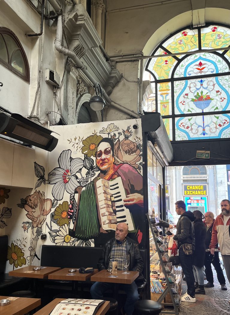 Right beside the Fish Market is the famous Çiçek Pasajı (Flower Arcade), built in 1870 as the Cite de Pera by Zografos Efendi to house small shops. Later it was home to the Naum Theatre which burned down in 1870. These days it’s full of meyhanes, this time undercover. It takes its name from the White Russian flower-sellers who sought refuge in Constantinople after the Bolshevik Revolution.