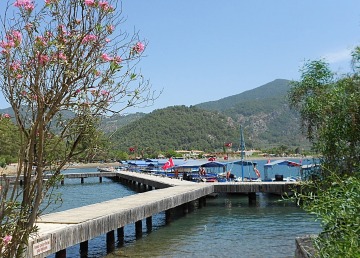 From Köyceğiz a road winds up into the hills and down the western shore of Lake Köyceğiz for about 26km to arrive eventually at the pretty little bay at Ekincik. Here a few fishing boats are still tied up and there are a couple of restaurants-cum-hotels at the back of the dark sand beach.