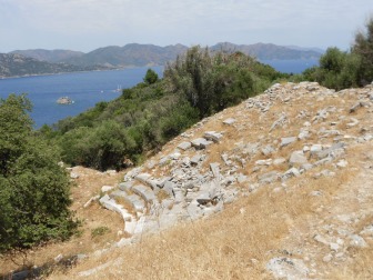 There’s not a lot to see here but as you climb from the roadside you will pass stretches of monumental wall probably dating back to Hellenistic times and created from huge chunks of irregularly shaped masonry. The path emerges on the headland with spectacular views down onto both bays. Here, too, are the slight remains of a small unexcavated theatre that would have shared the same great views out over the sea to the mountains.