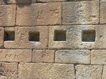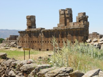 In a field east of the road can be seen the substantial standing remains of the Meclis Binası (Council House) whose most mysterious features are the Greek letters carved into the individual blocks of the outside wall. They look like mason’s marks and it’s easy to assume that they were intended to show the sequence in which the stones should be laid. However, some of the letters are upside down and others are out of sequence so their actual purpose remains unknown.