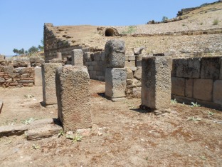 If you continue walking up the path through the village you will come eventually to the remains of a theatre in far worse shape than most such structures. The huge free-standing external walls survive well but the tiers of seating have almost entirely disappeared. On the other hand parts of the rooms behind the stage still survive as do the curiously stumpy Doric columns supporting the wings of the building.