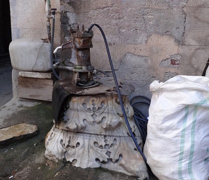 Old Byzantine capital casually reused as a fountain inside the Kurşunlu Hanı