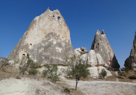 Close to the centre of Göreme amid spectacular Cappadocian scenery the frescoed Yusuf Koç Kilişe (church) is hidden inside a rock cone accessible by a battered ladder. Inside you’ll find yourself looking at a church that once had two internal domes, six columns and twin apses. Walls, ceiling and pillars were all covered with colourful 11th-century frescoes, most of them now much the worst for wear. One of the domes is intact although the other was broken when a pigeon-house was cut into it from the outside. One of the apses is also intact although the frescoed figures are covered in graffiti. The other was also shattered in modern times.