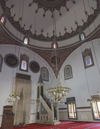 The only formal attraction in the small town of Bozüyük is the pleasant Kasımpaşa Cami, built between 1525 and 1528 and part of a complex whose old bedesten still survives right beside it (battered brick domes across the road probably mark the old hamam). A well-kept garden runs down to the triple portico in front of the mosque with the windows on either side topped with yellow and green tiles reminiscent of the ones that used to adorn the Haseki Hürrem Cami in İstanbul’s Cerrahpaşa. Inside, the mosque is a single room beneath a soaring, newly painted dome. Many of the original wooden window shutters survive, albeit with much of the inlay lost. There are also some fine marble details, especially in a small pillared structure in one corner than reminded me of a Byzantine structure. Near the door a mahfil box is also tiled and accessed via steep marble stairs.