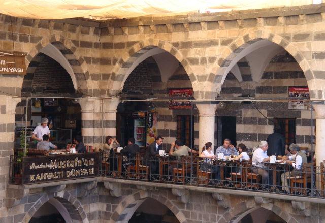We pause for lunch at a ciğ köfte stand just inside the Mardin Gate, then take a turn round the Cheese Market before heading off in search of the Dengbej Evi, my big find of the previous visit. Here in the courtyard of another lovely old stone house I had stumbled upon a cluster of old men gathered round a table to listen to one of their number who was singing to them unaccompanied. From time to time the others would tune in with what sounded like murmurings of assent: “Yes, yes, he’s right about that, I remember it well.” As they were speaking in Kurdish of course I didn’t actually understand the words but their meaning was clear. Then they had been sitting on the verandah of the house but today they’re in a much less picturesque huddle in the courtyard itself. Dengbej, I now know, was a Kurdish tradition of story-telling in song, now being kept alive courtesy of an NGO.