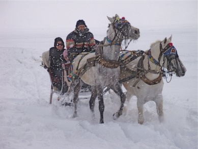Riding the ice was an extraordinary sensation. Snow had fallen on top of it and beneath that fresh snow was a layer of slush through which the horses ploughed heroically, sometimes stumbling so that the sleighs skewed to an angle. Zeki Bey was a picture of unhappiness and even I fretted over how good it could be for them – couldn’t they fall and break a leg? – but ahead of us stretched the snow and ice, never-ending, a vision of the Arctic in Turkey.