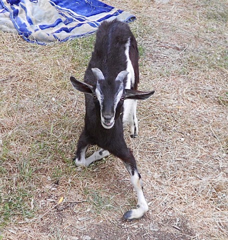 In the car park three kid goats are waiting to greet us. There’s Rambo and Rebi, both of them the second of twins born to mothers too young to be able to feed two. Then there’s poor little Gece, slightly older than the others and born with rickets so that he walks with his lower front legs bent under him as if he’s permanently on his knees.