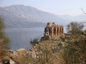 Hard though it is to believe it, what is now such a serene setting seems to have been a place of constant strife in the early Middle Ages, as evidenced by the ruins of many Byzantine castles both on the shore and on the islands in the lake. The first of these castles bestrides a headland signposted as you come into the village. The ruins make a wonderful spot from which to get your bearings, and to look down on the remains of ancient Carian rock tombs cut into a tiny off-shore islet.