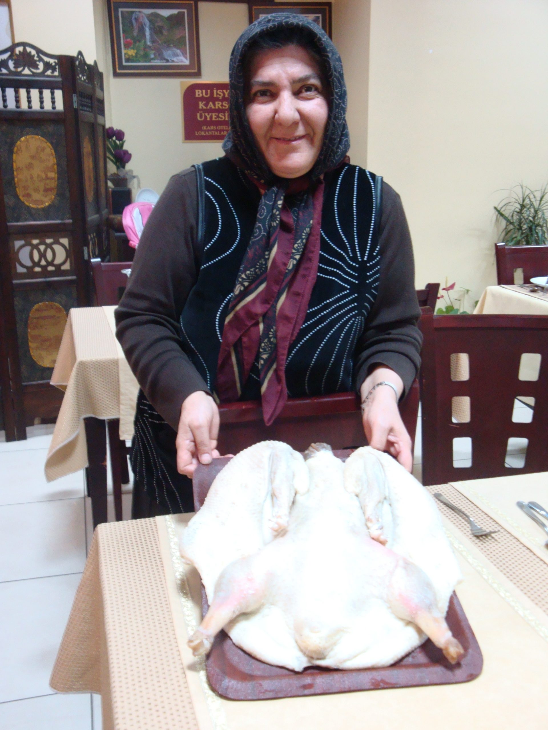 But in 2010 a restaurant whose sole raison d’etre was the serving of goose finally opened its doors on Sehir Polis Nuri Yıldız Sokak in downtown Kars. Nuran Özyılmaz and her daughters spotted a gap in the market for those who’d had their fill of kebabs. Soon they were roasting the birds in the Kars Kazevi on a seven-day basis, dishing up big helpings of goose on a bed of bulgur pilavı and turşu (pickles) with ayran to wash it all down. The birds were reared on local farms then slaughtered at about eight months and prepared for cooking by village women. “We eat everything,” said Nuran Hanım who learnt how to cook the birds from her mother. “But we only serve the main part of the body here – the village women keep the heads and feet.”