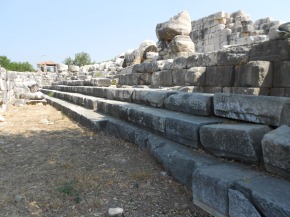 Tiered seating of small stadiumImmediately behind the oracle are slight remains of a small stadium including tiered seating, some of it with inscribed lettering that seems to have been put there to “bag” the seats.