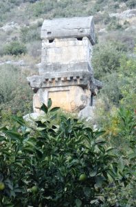 A little further along the main road if you look up to the left you will see a fine Lycian sarcophagus standing amid pomegranate, fig and tangerine trees. More rock-cut Lycian tombs lurk in the back garden of a house almost hidden in vegetation across the road from another stretch of city wall.