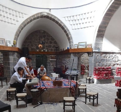 Nearby is the colourful covered market with, buried inside it, the Eski Hamam, restored to host sıra geceleri entertainments, and an old basalt-walled han that now has a cafe on its upper floor. There’s also a wonderful old-fashioned tea garden round a fountain that was once the main meydan (square). It reminded me slightly of the lovely Gümrük Hanı in Urfa’s bazaar.