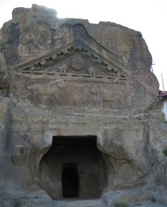 The house was built near the fine Arslanlı Mabet (Lion Tomb) which was originally carved out by the Phrygians and then reused by the Romans. The facade is carved with the images of two impressive lions (Phrygian) with, above them, two eagles one on either side of a shield (Roman). The structure is sometimes called the Tomb of Solon because a Greek inscription, also on the facade, mentions Solon.