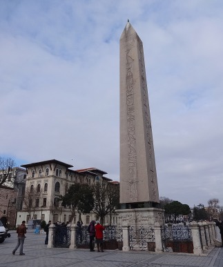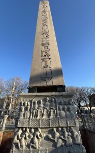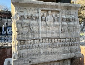 The most striking of the three monuments surviving from the spina is the granite Obelisk of Theodosius (Dikilitaş) brought to Constantinople from Thebes in Egypt where it had been carved with hieroglyphics in c 1450 BC. The obelisk – shorter now than it was originally – was erected on a double plinth which shows scenes of the Hippodrome in its heyday with the emperor watching a race from his private box before awarding a laurel wreath to the victor.