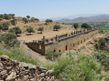The agora, however you reach it, is amazing, a flat plateau of grass now but fronted by a solid wall two storeys high and still completely intact. The lower part of this building was probably filled with small shops originally. Above them a long line of columns still survives dividing up what was originally a second storey whose purpose is unknown.