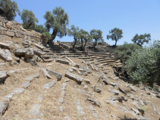 The path continues round the hillside to the right and brings you out eventually above the ruins of a large theatre that has yet to be excavated; olives grow up through the seating offering refreshing shade from the sun. From the far right-hand side of the theatre you can look out to the right and see two more standing towers from the lower walls.
