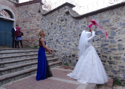 Tossing the bridal bouquet on Step StreetAround Balat