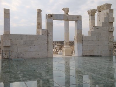But, you know, he was right. Sometimes, just sometimes, you can arrive at an archaeological site and so much work has been done to it that it seems completely new. Now I find that I can stroll along Syria Street in the footsteps of the Romans, pausing to inspect the ruts carved by wheels in the marble paving slabs and to admire the pieces of masonry reused as seats in the shade of the portico by economy-minded citizens. Off to the left lie the remains of the agora and of a huge bathhouse; off to the right a temple with some of its pillars re-erected to give an idea of what it would have looked like in its heyday.