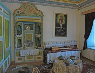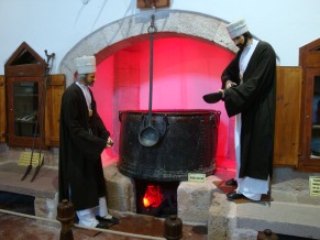On the left-hand side of the courtyard stand a guesthouse, bathhouse and laundry. However, the most important room is the Meydan Evi, an Alevi “cemevi (gathering house)” where initiation and other ceremonies were carried out. Focal point of this room is a stove with a 15th-century painting of Hacı Bektaş Veli on the wall above it and a huge wooden throne beside it. Most impressive is the fine wooden ceiling whose nine separate layers represent the nine levels of the heavens.