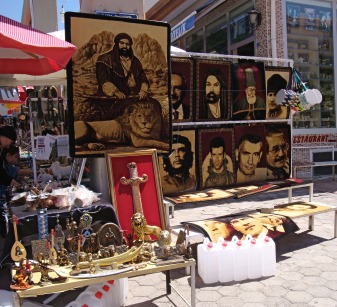 Street stall selling images of Ali, Hüseyin, Haci Bektaş Veli, Atatürk, Deniz Geçmis and other Alevi heroes