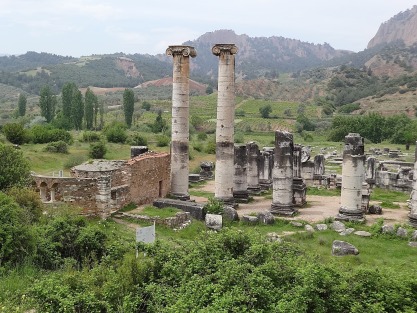 What is to be seen today dates back to a later remodelling, although the historian George Bean suggested that the unusually lofty column bases were a feature that should be traced back to the Lydians. A couple of inscriptions written in both Greek and Lydian were found here. There are also remains of a later Byzantine church.